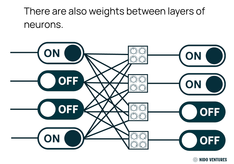 Picture a wall covered with switches. Each switch checks the incoming signal and decides whether to flip on or stay off. In this analogy, every switch is a single neuron: it activates only when the input matches the pattern it has learned during training. (note: modern neural networks are not entirely binary, but rather they have a spectrum of “on-ness” and “off-ness”, more like a light dimmer than a switch).