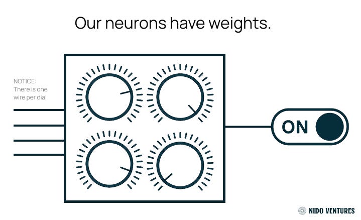 But what actually drives those switches? It’s the weights, or parameters: simple numbers that scale each input signal before it reaches a switch. Every switch sees not just one signal but a whole set: each input is multiplied by its own weight (adjusted by its own dial in our metaphor), and then all those products get summed into a single value. When that total reaches or passes the switch’s threshold, the switch flips on. You can picture the weights as a control panel full of tiny knobs. During training, the model tweaks each knob little by little until the right combination of scaled inputs makes the exact switches light up to give us the output we want.